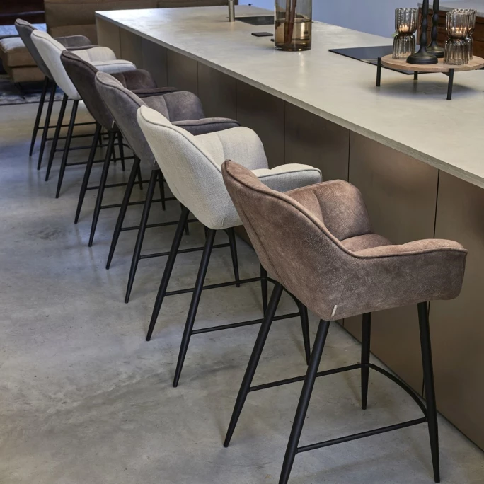 Modern und elegant: Die Carnaby Stühle von Rivièra Maison passen einfach zu wirklich jeder zeitgemäßen Wohnraumeinrichtung! Das robuste Eisengestell verleiht dem schicken Barhocker einen industriellen Touch, während der gesteppte Polyesterbezug für einen trendigen Charme sorgt. Egal ob im Esszimmer, in der Küche oder an der Bar: Der Carnaby Barhocker sieht einfach überall gut aus und sorgt durch seine dicke Polsterung und die leicht geschwungenen Armlehnen für einen bequemen Sitzkomfort. Kombinieren Sie doch einfach die verschiedenen Stoffe und Farben der Carnaby Stühle miteinander und kreieren so im Handumdrehen ein stilvolles Ambiente in Ihrem Ess-, Küchen- oder Wohnbereich – Sie werden begeistert sein!