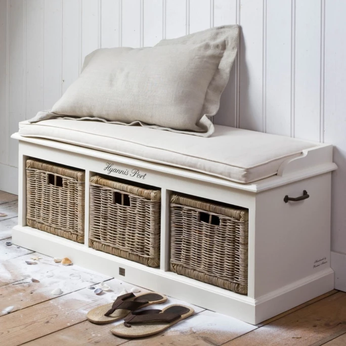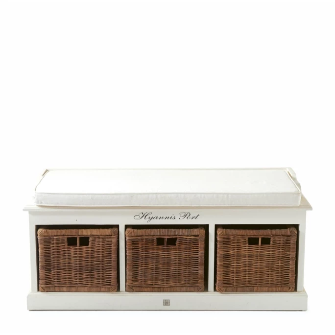Egal ob im Flur, in der Küche im Wohn-, Ess-, Schlaf- oder Kinderzimmer: Die Hyannis Hafenbank mit Aufbewahrung von Rivièra Maison sieht einfach überall gut aus! Aus recyceltem Hartholz gefertigt, begeistert die praktische Sitzbank durch einen schlichten Landhaus-Look mit maritimem Touch. Die beiden seitlichen Griffe, die kleinen Zierleisten an den schmalen Seiten und der Rückseite und der geschwungene “Hyannis Port” Schriftzug runden das optische Gesamtbild der Rivièra Maison Sitzgelegenheit perfekt ab. Der Clou: Hyannis verfügt über drei Fächer mit robusten Rattankörben. So sind Schal, Mütze, Hausschuhe, Taschenschirm, Spielzeug oder Zeitschriften und Handarbeitsmaterialien ordentlich und jederzeit griffbereit verstaut – einfach genial! Überzeugen Sie sich selbst und bringen mit der Hyannis Hafenbank mit Aufbewahrung von Rivièra Maison ein stillvolles und praktisches Möbelstück in Ihr Zuhause!