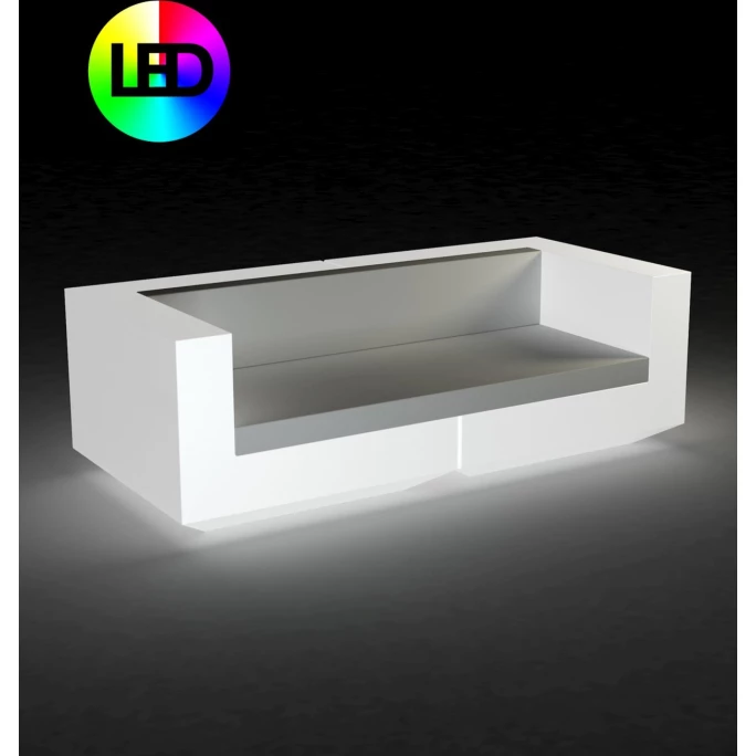 Das wunderschöne Vondom VELA RGB LED Sofa des Designerlabels Vondom, besticht mit einem extravaganten Design, dass als fliesendes Formspiel sofort im Mittelpunkt steht. Designend wurde die Edelserie von dem spanischen Art Director Ramón Esteve, der mit der umfangreichen VELA Outdoor-Möbel- und Pflanztopfkollektion darauf abzielt, Komfort und die Qualität von Innenmöbeln zu bieten. Die Edelmarke Vondom schafft damit einen harmonischen Dialog zwischen Umwelt und Form, welche als Designkultur auch den einfachsten Raum in ein Ambiente voller Glamour, Einzigartigkeit und Außergewöhnlichkeit verwandelt. Das spanische Luxuslabel Vondom ist dabei weitaus mehr als nur eine Designermöbelmarke. Die Firmenphilosophie beruht auf der Schaffung exklusiver und zeitloser Stücke aus nachhaltigen, recycelten und recycelbaren Materialien. So werden Kunststoffabfälle aus dem Meer in recycelbare Produkte umgewandelt, welche selbstverständlich die hohen Qualitäts-, und Designstandards einhalten für die Vondom bekannt ist. Als Endergebnis entstehen nachhaltige Designermöbel die nie mehr weggeworfen werden, sondern ewig halten. Gefertigt wurde das wunderschöne VELA RGB LED Sofa aus Polyethylenharz, ein sehr vielseitiger Kunststoff mit vielen Vorteilen gegenüber anderen Materialien. Er hält extremsten Wetterbedingungen stand, Wasser kann ihm genauso wenig anhaben wie Sonnenlicht, er ist schlagfest und seine Farbbrillianz bleibt über die gesamte Nutzungsdauer erhalten. Die wunderbar weiche Auflage des VELA RGB LED Sofa kommt in der edlen Soft-Kunstleder Ausführung NAUTIC daher, die sich selbstverständlich auch für den Außenbereich eignet. NAUTIC ist dabei eine Echt-Leder Variante, die besonders dick, robust und leicht zu reinigen ist. Erleben Sie schöne Stunden im Garten, auf dem Balkon oder als Highlight in jedem Wohnbereich mit dem In-& Outdoor VELA RGB LED Sofa. Ganz besonders zur Geltung kommt der Designer-Tisch bei Nacht, wenn das integrierte RGB-Licht anfängt zu strahlen. Das wunderschöne Lichtspiel wird bequem per Fernbedienung bedient und leuchtet in einem tollen Farbton in Weiß, Rot, Grün, Blau, Rosa und Gelb. Ganz nach Ihrer Stimmung wählen Sie das passende Licht manuell aus oder lassen es im Automatik-Modus von selbst seinen Glanz versprühen. Die pflegeleichte Designer-Sitzgelegenheit lässt sich besonders einfach reinigen, es genügt sie mit einem feuchten Tuch und Wasser abzureiben. Fertig! Wählen Sie das für Sie passende Sofa in schlichter Eleganz, in verschiedenen Farben. Wir bieten Ihnen immer die perfekte Auswahl hier in unserem Ambiendo Shop. Mit dem eleganten VELA RGB LED Sofa zieht ein frisches Designelement mit dem Hang zur Perfektion bei Ihnen ein. Bestellen Sie jetzt!